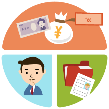 報酬は、書類作成報酬(しょるいさくせいほうしゅう)、事案調査報酬(じあんちょうさほうしゅう)、面接報酬(めんせつほうしゅう)から構成(こうせい)され、別途、旅費(りょひ)等の実費(じっぴ)が請求されます。
